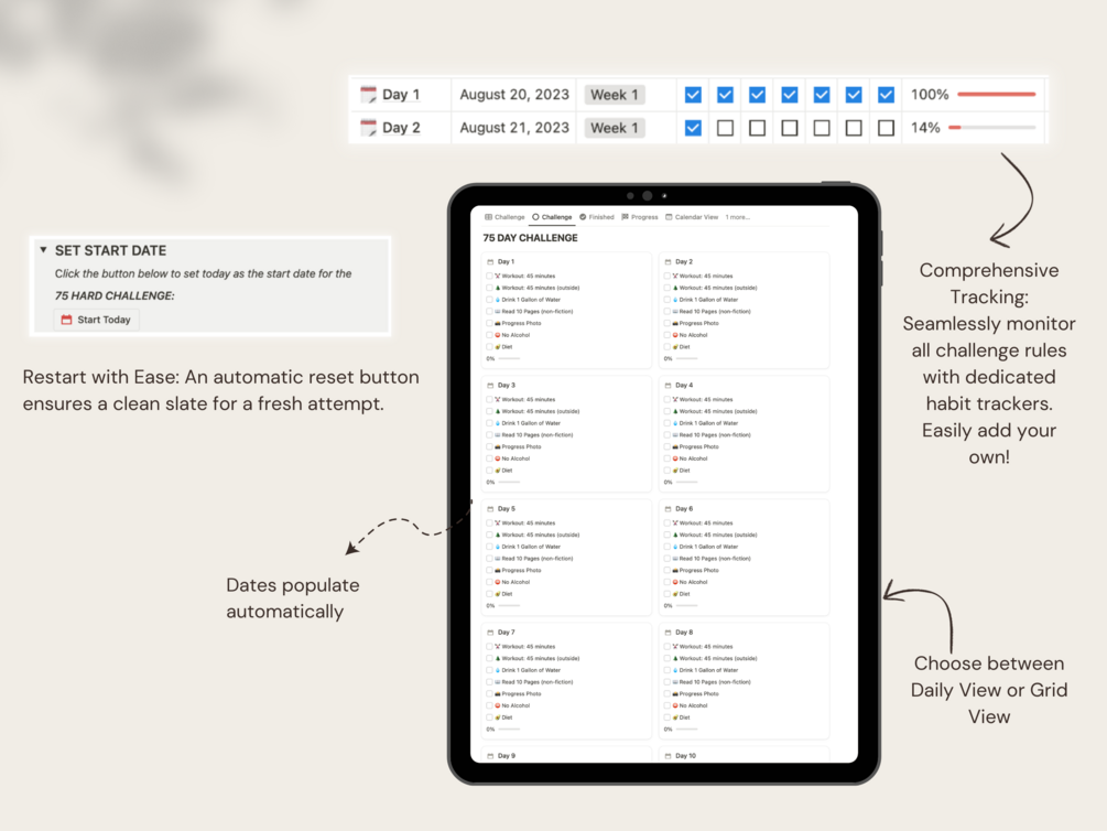 75 Day Challenge Notion Template | Customizable Habit Tracking Tool