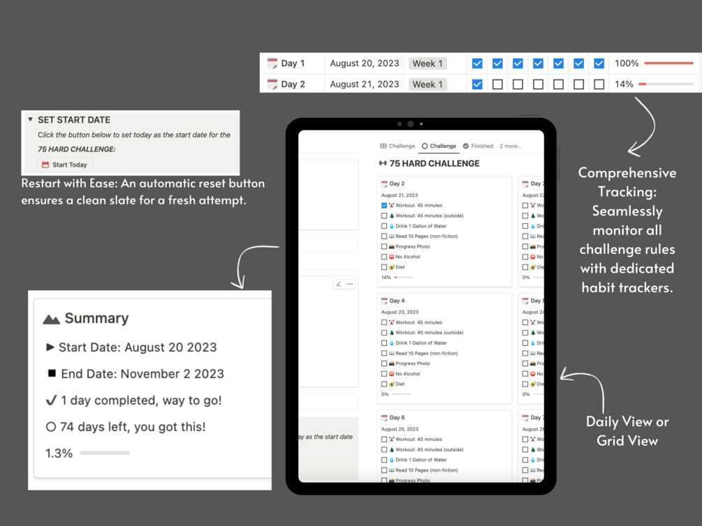 75 Hard Challenge Tracking Notion Dashboard Template Planner