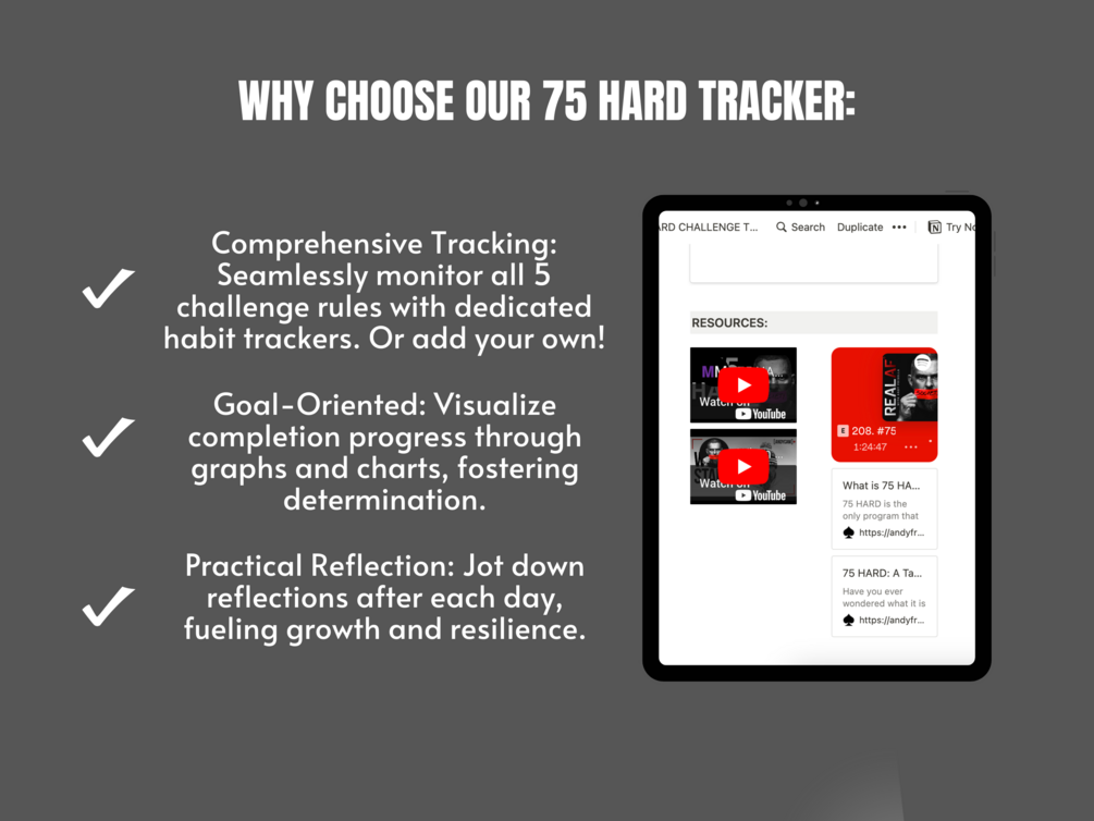 Don't just survive the 75 Hard Challenge β thrive through it. Elevate your mindset, conquer your limits, and redefine success. Invest in your growth today with the Ultimate 75 Hard Challenge Notion Dashboard.