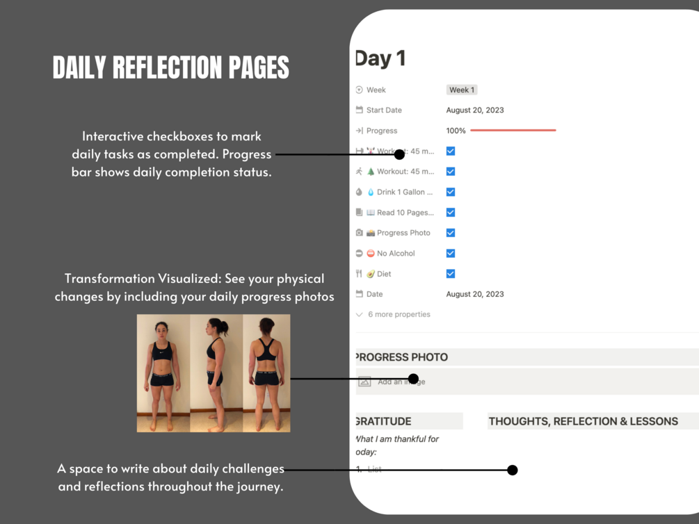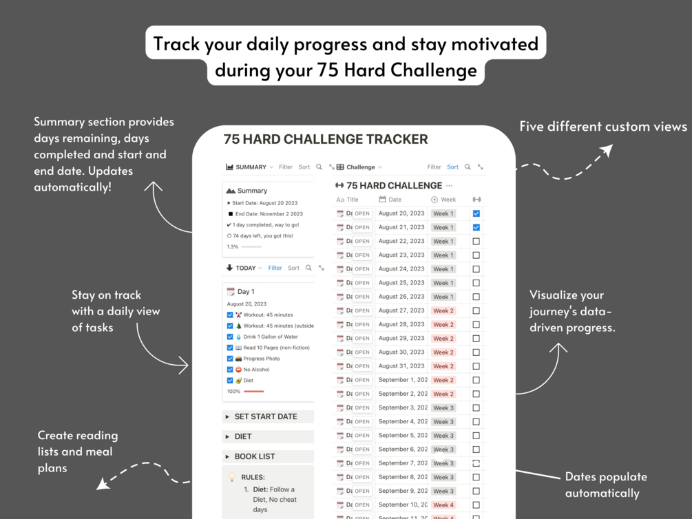 Are you ready to conquer the 75 Hard Challenge and transform your life? Elevate your journey with our meticulously designed Notion dashboard, crafted to empower you every step of the way. Whether you're a fitness enthusiast, trying to get healthy, or simply seeking personal growth, our template is your all-in-one solution to smashing your goals.