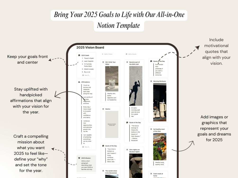 Say goodbye to scattered notes and hello to focused, intentional living with our Notion 2025 Vision Board Template!