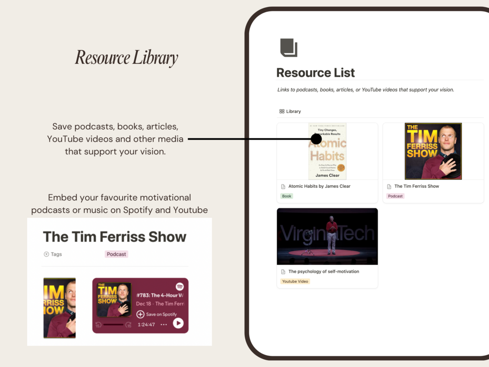 ✔️ Resource Library: Access links to podcasts, books, articles, or videos that support your vision and keep you inspired.