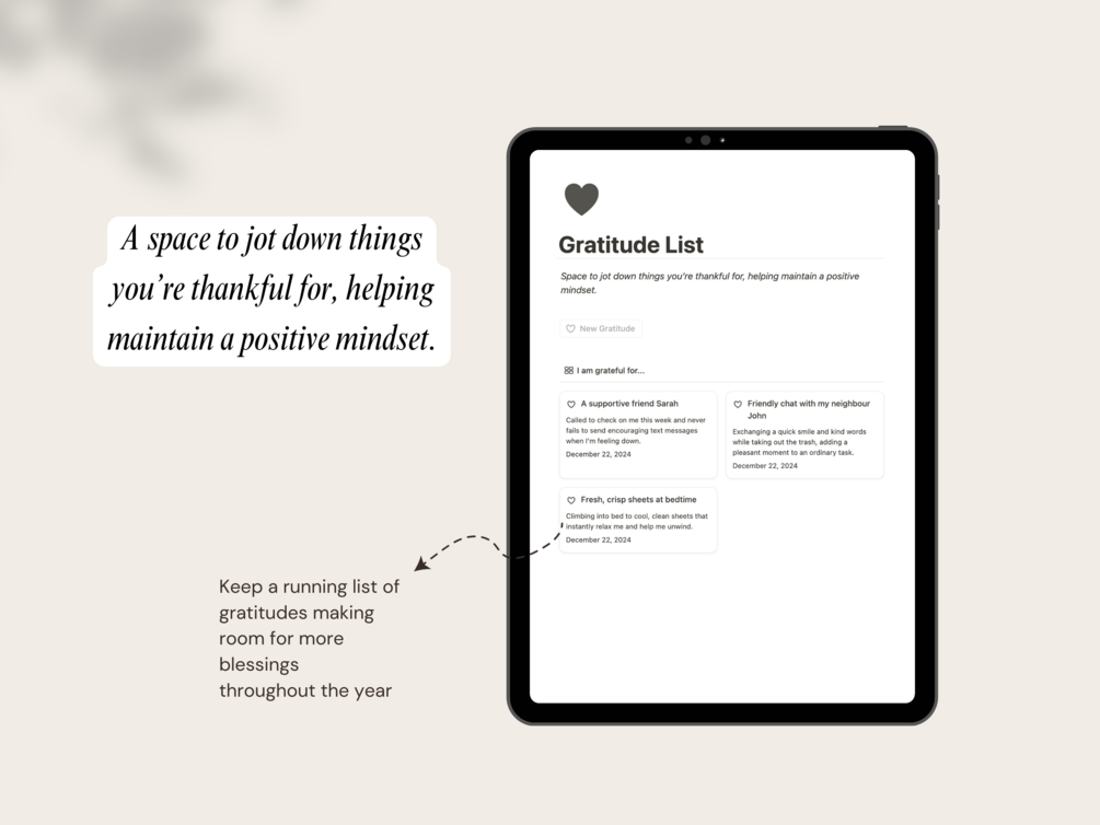 ✔️ Gratitude List: Cultivate a positive mindset by jotting down daily or weekly gratitude entries.