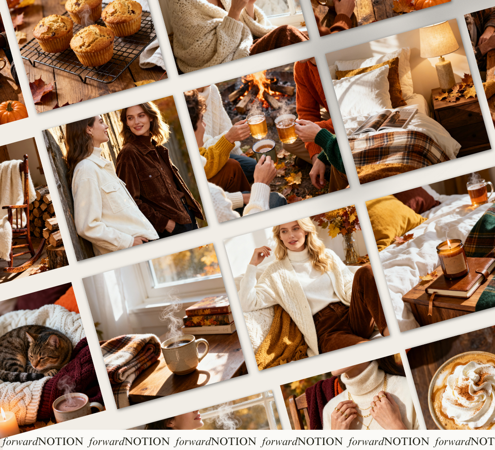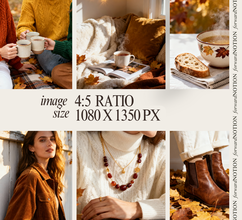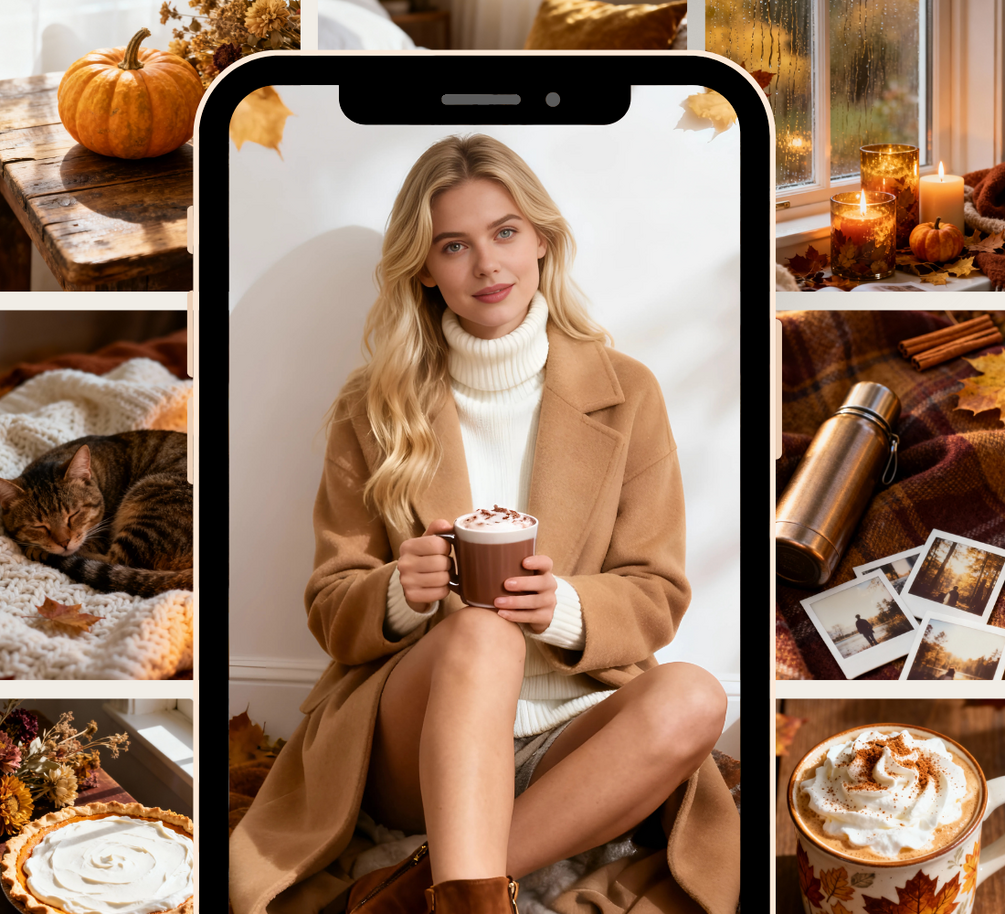 ✔️ A mix of lifestyle, flatlays, food, and seasonal details – cozy sweaters, candles, pumpkin spice lattes, books, autumn leaves, and fall gatherings.