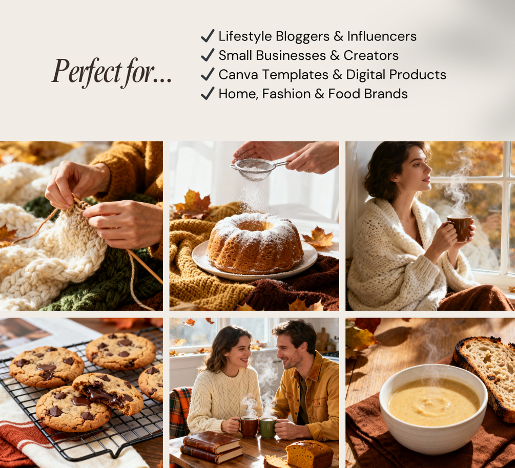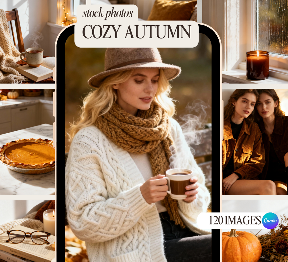 Capture the magic of fall with the Cozy Autumn Stock Image Bundle! Featuring 120 high-quality, AI-generated and human-edited images, this set is filled with warm autumn tones, cozy knits, pumpkin spice moments, and golden seasonal light.