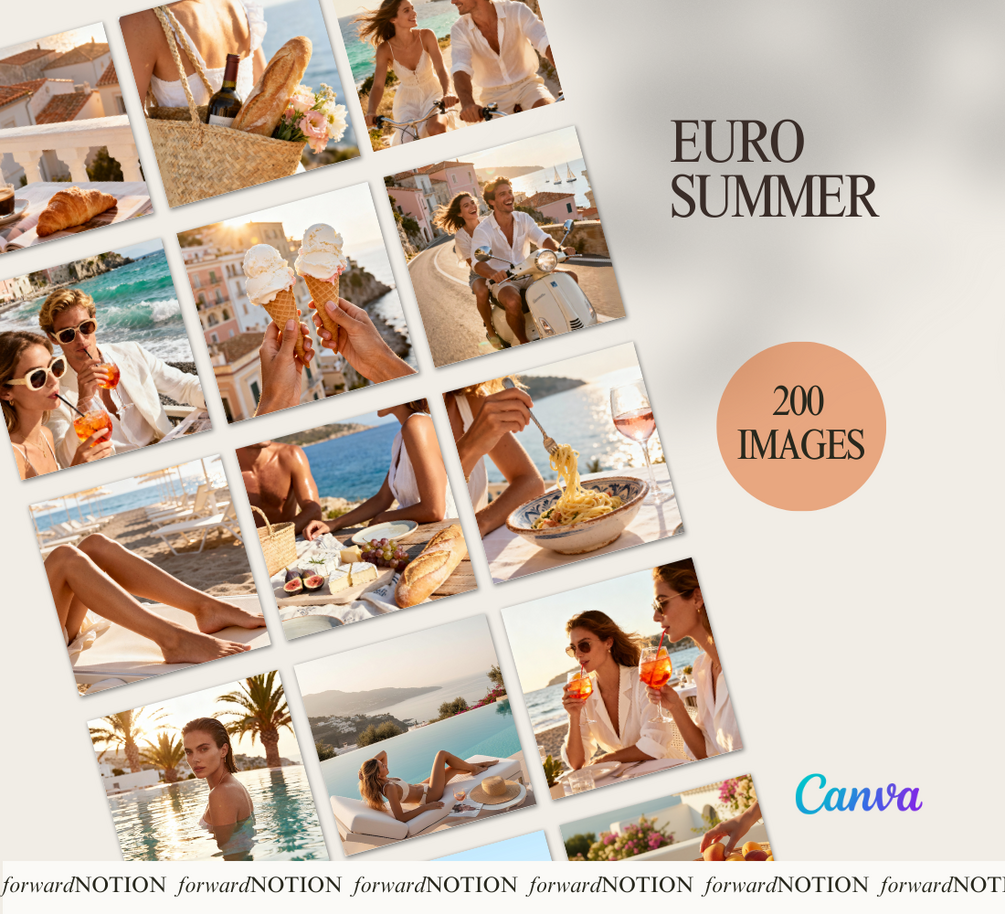 Bring the magic of a European summer to your brand with the Euro Summer Stock Image Bundle! Featuring 200 high-quality, AI-generated and human-edited images, this collection captures the dreamy coastal aesthetic—sunlit aperitifs, scooter rides, seaside dinners, cobblestone strolls, and warm golden light.