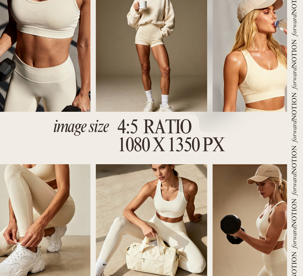 100 curated stock photos in a minimalist, neutral-toned activewear and fitness lifestyle aesthetic.