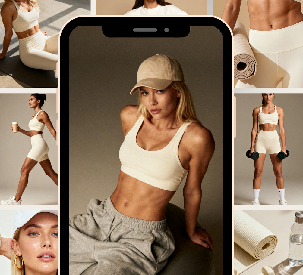 Mix of lifestyle & detail shots – workouts, athleisure, gym props, hydration, and wellness moments.