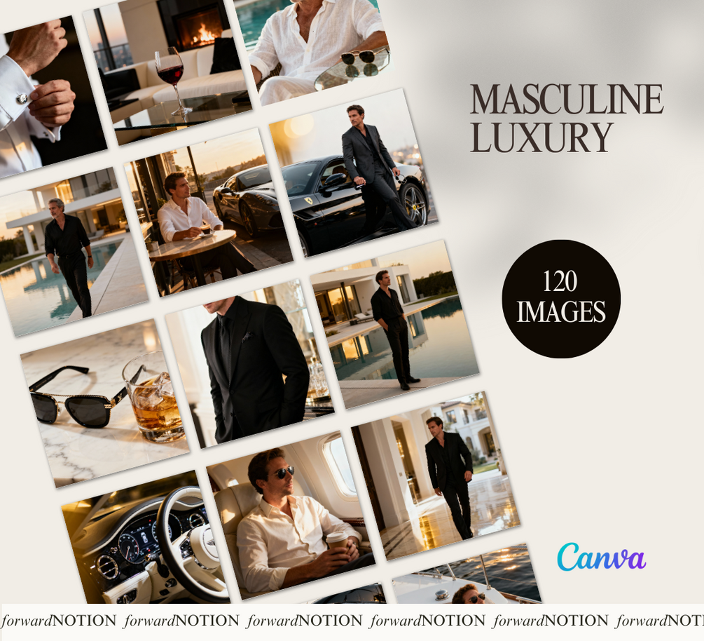 ✔️ 120 curated stock photos with a masculine, luxury lifestyle theme.
